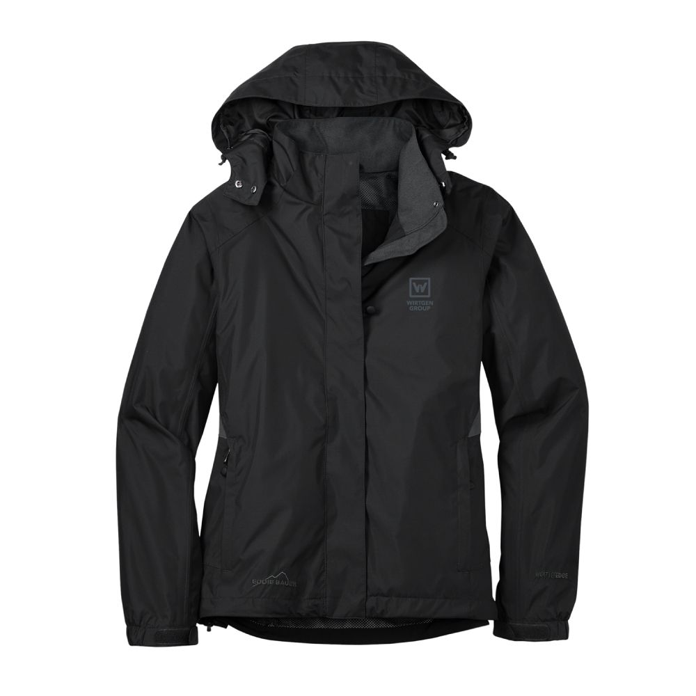 Eddie Bauer Women's Rain Jacket. From misty mornings to evening downpours, this fully seam-sealed, completely waterproof colorblock jacket will help keep you dry, warm and protected from whatever Mother Nature throws at you. Highly waterproof and breathable 5K/5K fabric 5000MM fabric water protection rating, 5000G/M2 fabric breathability rating, detachable hood with locking drawcord for adjustability, exterior storm flap with hook and loop closures, front Vislon zippered pockets, adjustable tab cuffs with hook and loop closures and an open hem with locking drawcord. Embroidered Eddie Bauer contrast logo on right hem. WeatherEdge embroidered logo on left sleeve indicates reliable waterproofing and breathable technology 100% polyester dobby shell, mesh body lining. Wirtgen Group logo embroidered on the left chest.